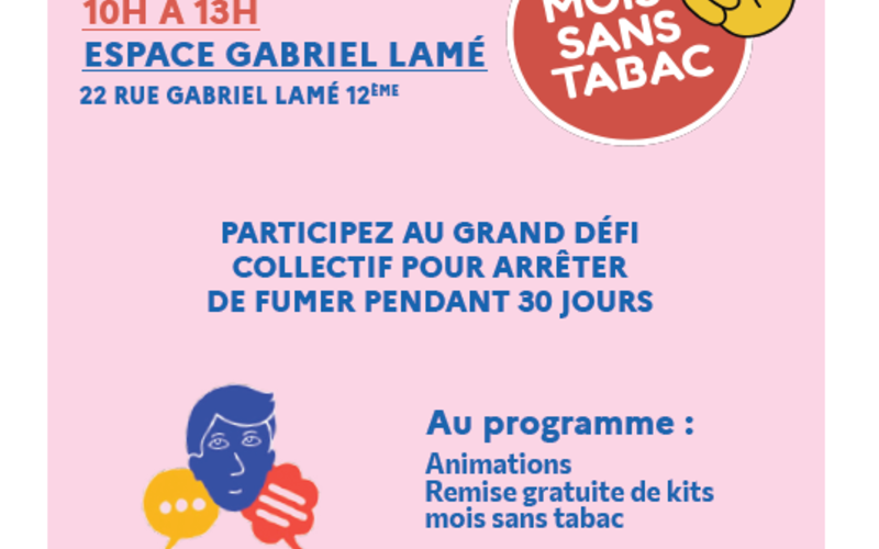 À l’occasion de la 10ᵉ édition du Mois sans tabac, la Mairie du 12ᵉ arrondissement se mobilise et propose à ses habitantes et habitants un temps de sensibilisation autour de l’arrêt du tabac, le 13 novembre de 10h à 13h à l'espace Gabriel Lamé, situé au 22 rue Gabriel Lamé dans le quartier de Bercy.