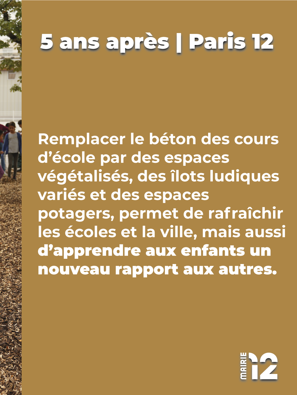 Remplacer le béton des cours d’école par des espaces végétalisés, des îlots ludiques variés, comme des coins calmes ou de lecture, des murs d’expression, des cabanes, des amphithéâtres, des espaces potagers ou encore des structures de jeux, c’est un des grands projets structurants de la mandature. Alors que 19 cours ont déjà été aménagées dans le 12ème, 3 autres seront transformées d’ici 2026. La moitié des écoles de l’arrondissement disposeront bientôt d’une cours Oasis !
