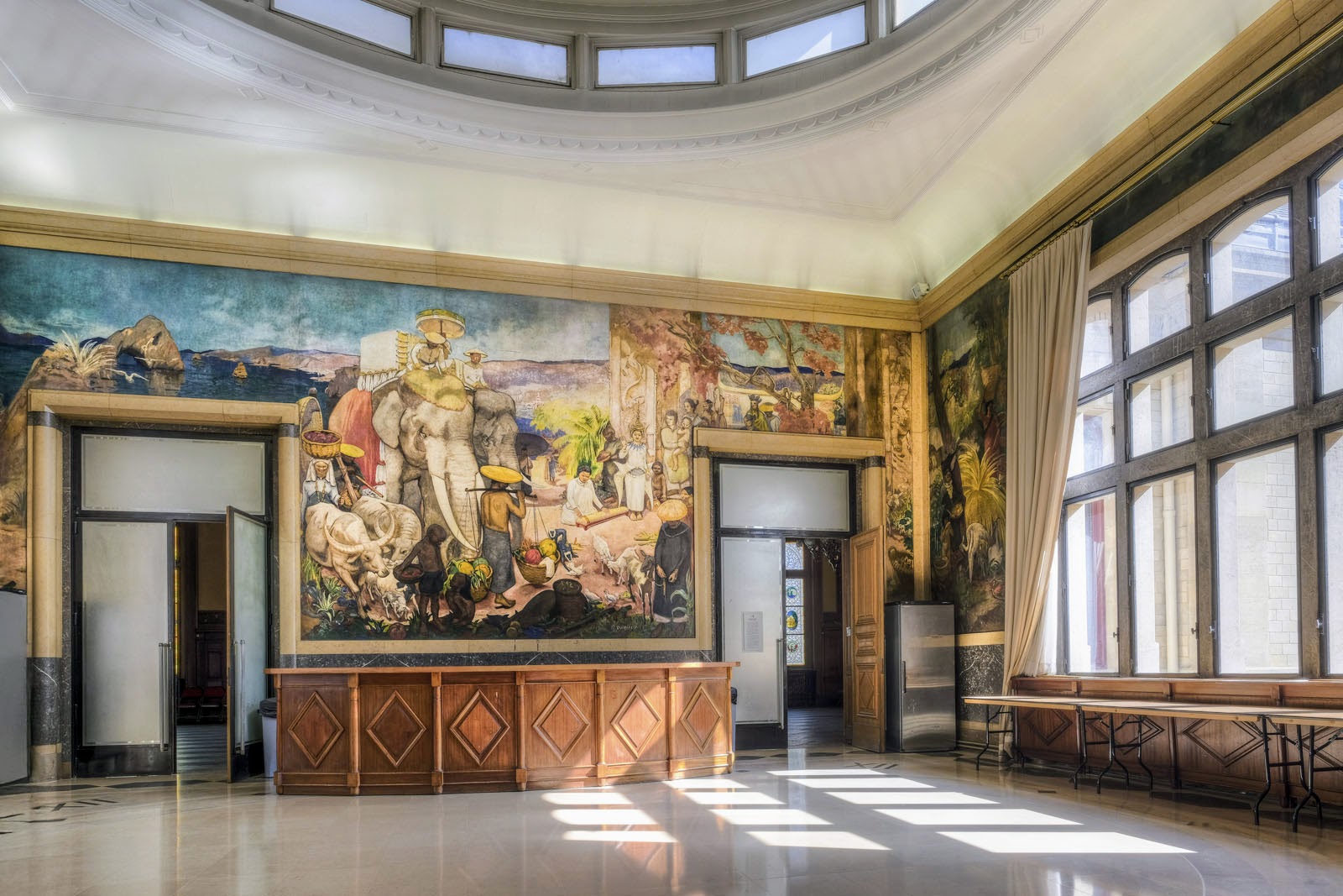 Ce salon se distingue surtout par son décor peint, qui constitue un témoignage majeur de l’imaginaire colonial français. Ces décors muraux oeuvres de deux artistes, Louis-Jean Beaupuy (1896-1974) et René Durieux (1898-1952) trouvent leur origine dans l’Exposition coloniale de 1931. Commandés pour cet événement, ils étaient exposés dans la salle du Tourisme du musée des Colonies (aujourd’hui le Palais de la Porte Dorée - Musée national de l’histoire de l’immigration), de mai à novembre 1931. Cette manifestation s’inscrivait dans la tradition des expositions universelles, vouées à exalter la puissance technologique et alors dite civilisatrice » des pays européens et nord-américains, tout en occultant les violences, les dominations et les réalités propres aux systèmes coloniaux.