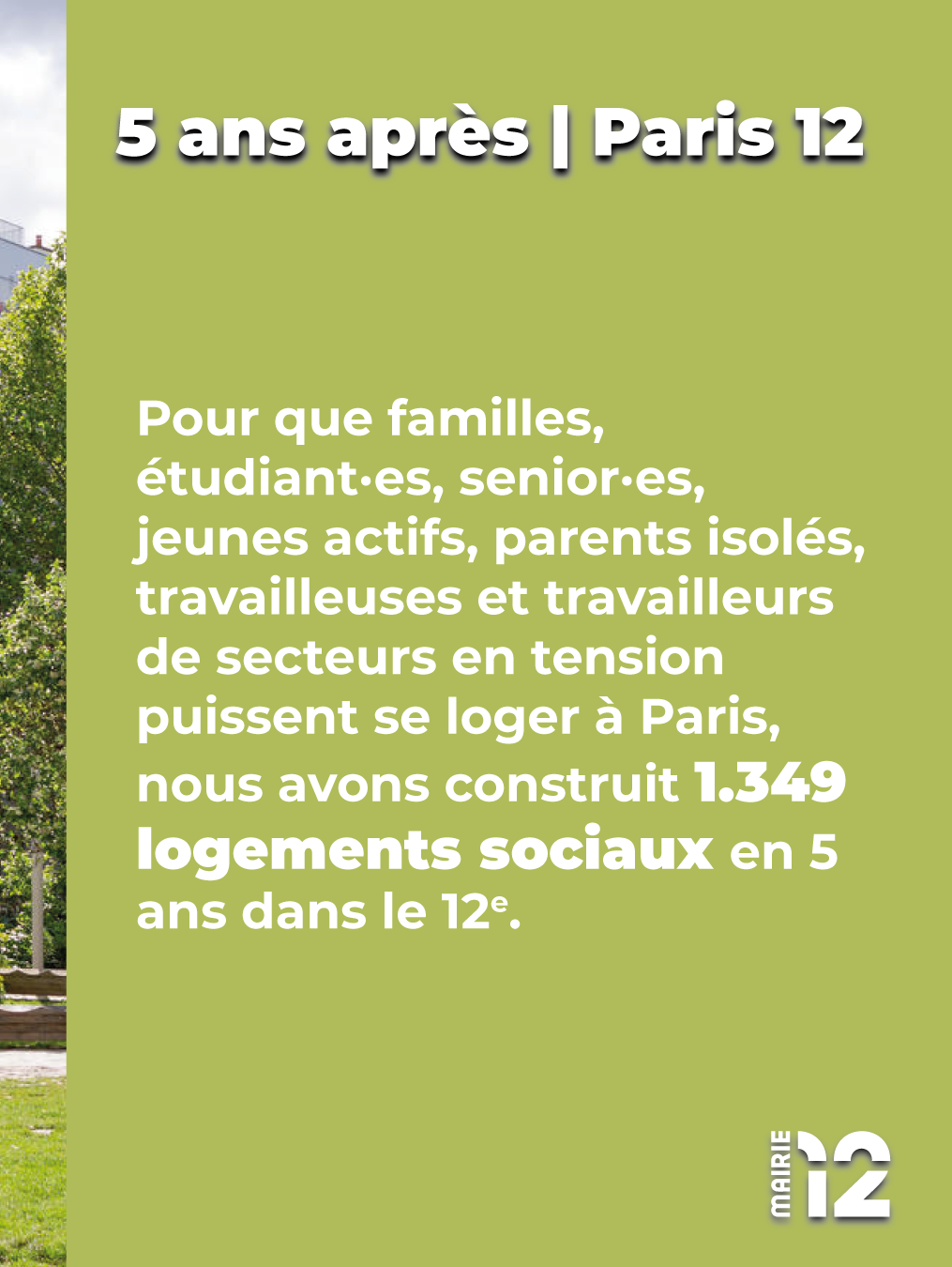 Dans le contexte parisien, l’accès à un logement décent et abordable demeure un enjeu majeur. La Ville de Paris et la mairie du 12e arrondissement, s’engagent résolument en faveur d’une politique du logement portée par la justice sociale. Notre objectif : faire en sorte que chaque habitant·e, qu’il·elle soit famille, étudiant·e, senior·e, jeune actif·ve, parent isolé·e ou travailleur·se, puisse trouver sa place dans notre ville. Notre ambition est de faire du 12e un quartier où chacun·e peut s’épanouir, dans un cadre où solidarité, écologie et justice sociale convergent.