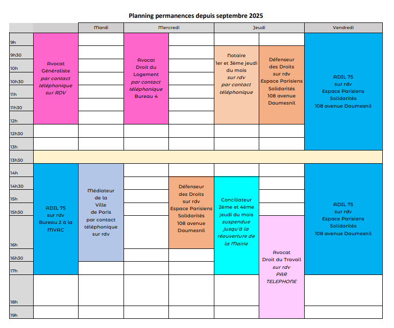 Permanences le mercredi de 14h à 16h et les 2è et 4è jeudis de 9h à 12h, uniquement sur rendez-vous. Vous pouvez prendre directement rendez-vous en ligne (en cliquant sur le bouton rouge ci-dessous) ou en téléphonant au 01 44 68 12 12.
